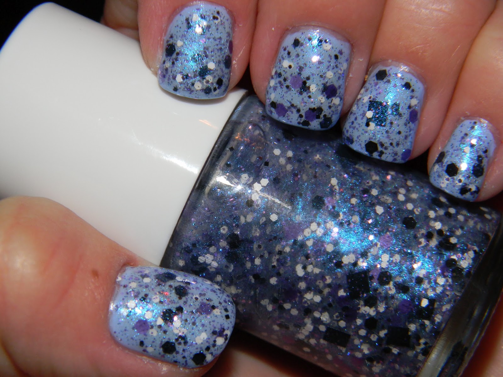 This new franken I made yesterday. It's another chunky glitter one, but that is my thing. I may go ahead and list this one at my Etsy store maybe Monday morning. I started with a clear glitter suspension (3 free) base. I added some blue color shifting shimmer pigment. I then added a ton of purple shades, black, navy and white glitters.
